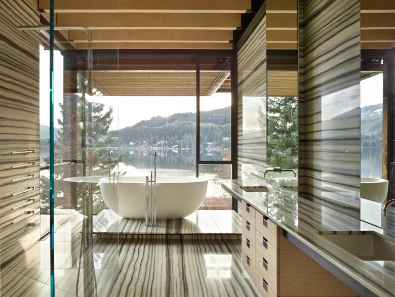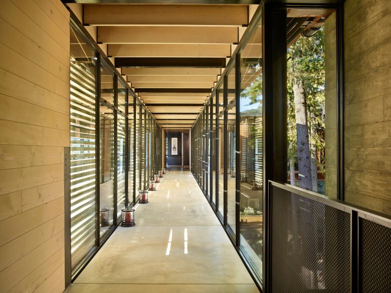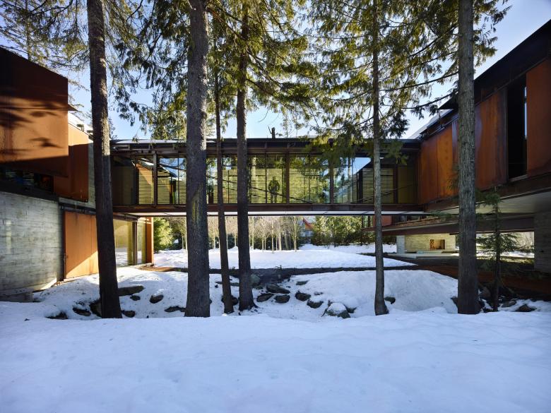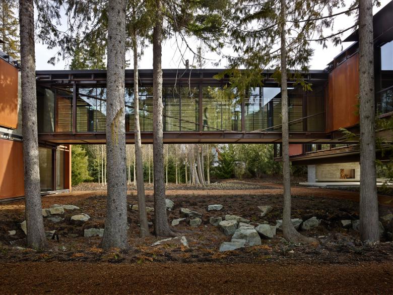 The bridge not only creates privacy between the two wings but also weaves through a grouping of evergreens. By spreading out the house across the site trees were preserved but views were also maximized. On one side the floor-to-ceiling windows overlook a mountain lake stretching across the foot of the property; on the other side is a forest of firs, hemlocks and aspens.