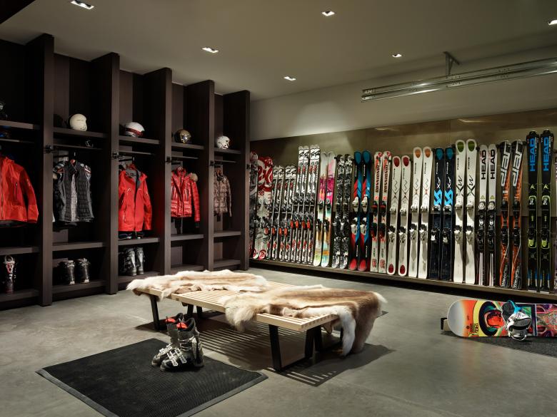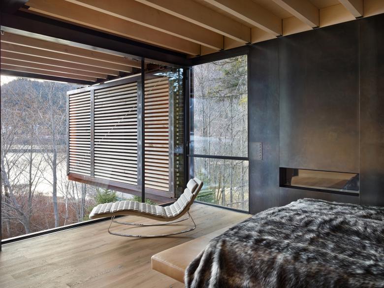 A custom designed horizontal shutter system creates privacy and also protects upholstery and art from harsh snow glare. With simple crank and switch controls the façade can transform from glass clad to semi-exposed with raw-edged Douglas fir louvers, to completely protected with weathered steel.