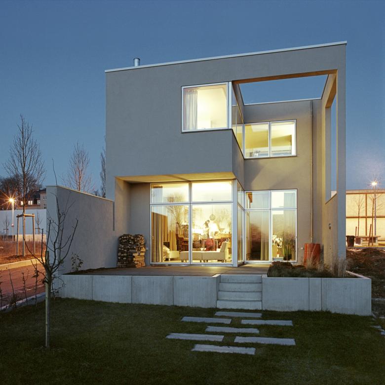 Das Haus ergänzt die zeitgenössische Siedlung um ein Ensemble aus Wohngebäude und zugehörigen Garten. Nach den strengen Regularien des Bebauungsplanes erfordert das Hauskonzept den Umgang mit dem direkten Anbau an das vorhandene Wohnhaus im Norden (siehe Haus des Jahres 2005) und damit die thematische Bewältigung von räumlicher Nähe und Wahrung von privatem Raum, sowie von eigenständiger Repräsentanz und nachbarschaftlicher Korrespondenz.