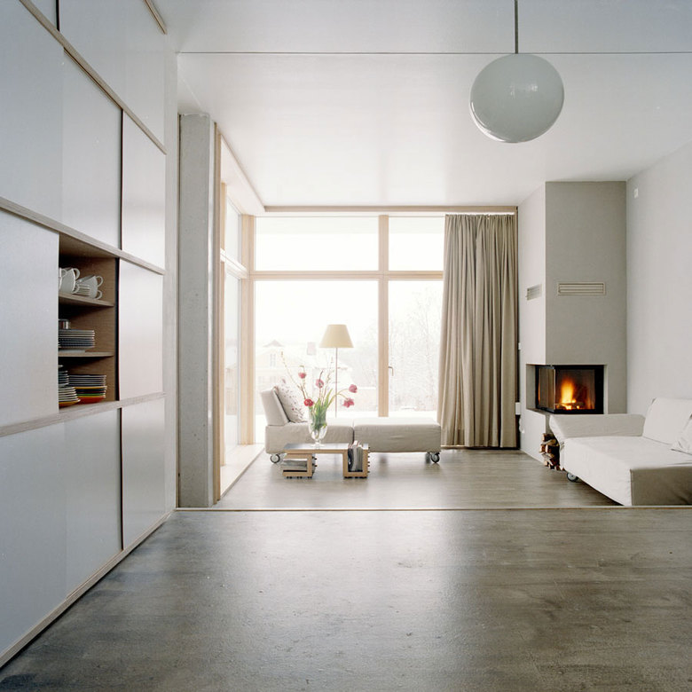Im Innern des Hauses dominieren schlichte weiße Wände und Decken mit dem sachlichen, klaren Sichtbeton und dem lebendigen, kräftigen Holzdielenboden (Thermo-Eiche). Diese Materialien werden zu Bauteilen ausgeformt, wie zum massiven Küchenblock als standhaften Treffpunkt für Familie, Freunde und natürlich Nachbarn.