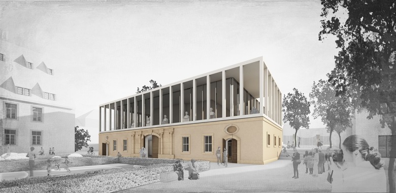 Die Architektur des Hauses nun antwortet auf die stadträumliche Konzeption durch einen starken Solitär, welcher vom Raum der Stadt quasi umspült wird. Dem Mauerfragment des alten Künstler- bzw. Zeughauses wird in strenger Form eine Kolonnadenreihe aufgesetzt, welche zugleich einen Umgang, einen Wandelgang erzeugt. Und dieser fasst und verbindet die vorhandenen Strukturen und erweist sich als der besondere Kerngedanke des Entwurfs. Einerseits wird hier die Figur des Tempels oder der Stoa aufgerufen, möglicherweise ein architektonisches Zeichen für die alte Polisdemokratie (die Verfasser verweisen darauf), andererseits verbindet diese Schicht der Arkaden Innenraum und Außenraum, Haus und Platzraum auf sehr schöne Weise, weil dadurch auch der Mensch, das Publikum als Herr der Szene auftreten kann und weil hier das Höhenniveau von Theaterplatz und Ausstellungsebene zu einer Art Stadtterrasse über dem grünen Platz geführt wird. Zudem vermittelt die Kolonnade einerseits eine gewisse Monumentalität, andererseits große Leichtigkeit.
