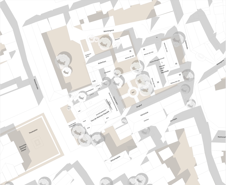 „Der Konzeption dieser Arbeit führt zu einer sehr einprägsamen Baufigur, in welcher der stadträumliche Ansatz und die architektonische Idee sich ideal ergänzen. Die städtebauliche Konzeption eines neuen Platzes auf der Ostseite produziert eine schöne Raumfolge vom Theaterplatz über den neuen Platz bis zum Platz am Donndorfbrunnen. Während der bedeutungsschwere Theaterplatz ein eher steinerner Platz ist, soll – und das wird von der Jury befürwortet - der neue Platz eher eine grüne Stadtoase sein. Dabei ist für den Entwurf wichtig, dass beide Plätze durch die Süd-und-Nord-Passage so eng wie möglich verbunden sind und zum Flanieren einladen - an der Südseite durch den engen, steilen Pfad, an der Nordseite aber durch einen relativ weiten Raum mit großzügiger Freitreppe. Diese Bewegungslinien finden dann in der weiteren städtebaulichen Lösung ihre Fortsetzung, wobei anzumerken ist, dass die stark historisierende Freiflächengestaltung des Platzes zu überdenken wäre. Die städtebauliche Lösung insgesamt gliedert die Stadträume in sinnvoller Weise, insbesondere wäre – wie im Entwurf vorgesehen – die Einrichtung einer öffentlichen Kulturfunktion im Gefolge der Platzräume zu begrüßen. Im Detail sieht die Jury hier allerdings Korrekturbedarf.