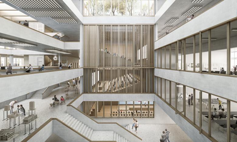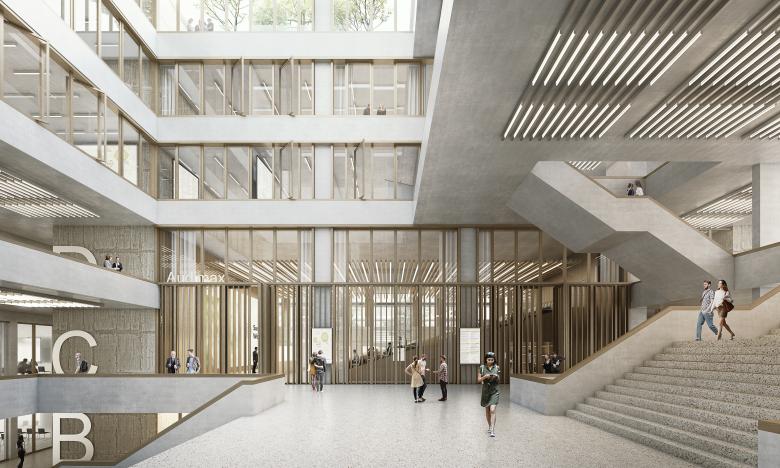 In den beiden Neubauten entwickeln sich die hochflexiblen und einfach anpassbaren Unterrichts- und Büroräume um zentrale Atriumfiguren und Erschliessungskerne. Die Atrien selbst bilden die identitätsbildenden Nuklei des Campus. Sie vernetzen alle Institute der jeweiligen Schulen untereinander und mit den übergeordnet genutzten Sockelgeschossen, in denen die gemeinsamen Nutzungen für den Gesamtcampus liegen (Bibliothek, Mensa, Audimax, Campusaula etc.).