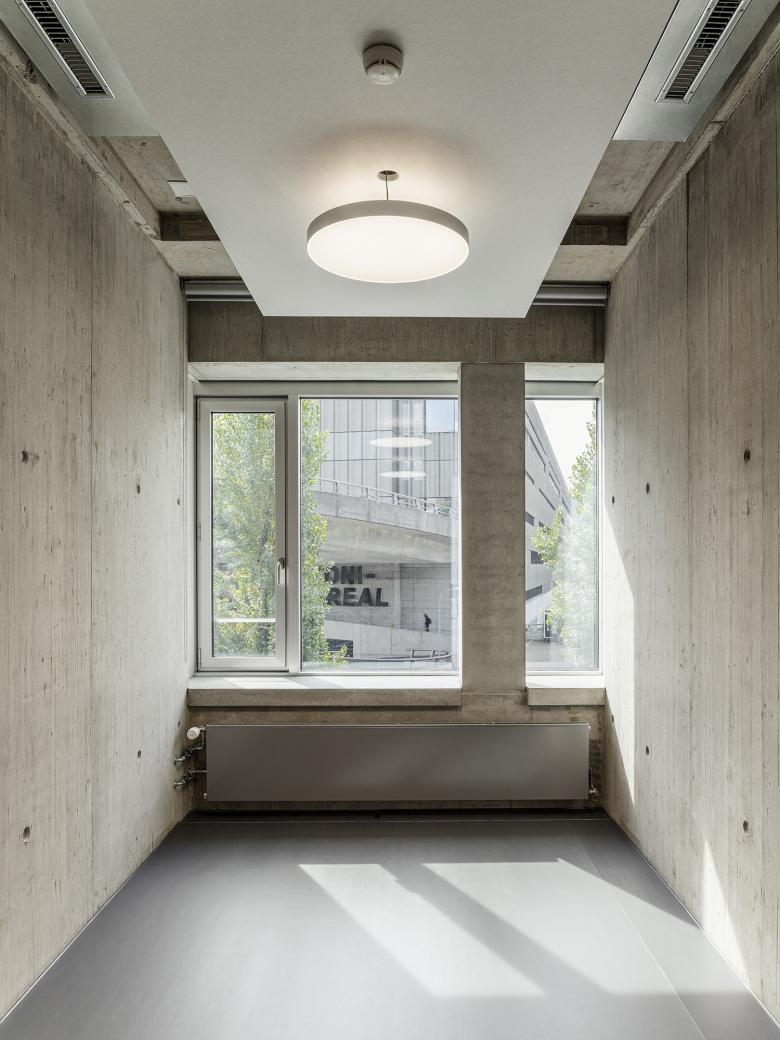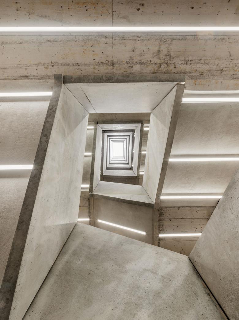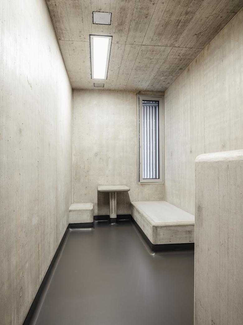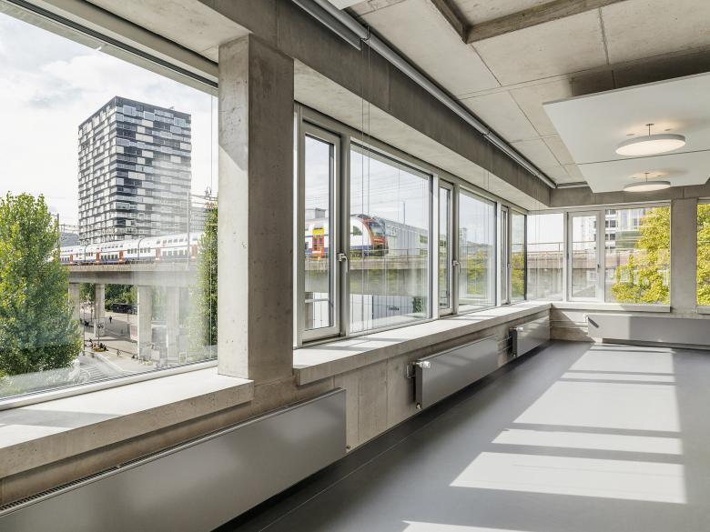 Zur Förrlibuckstrasse kragt das Gebäude aus und schafft mit dieser Geste einen repräsentativen, gedeckten Eingangsbereich, von dem aus man zum öffentlichen Showroom und Detektivbüro sowie zum Erschliessungskern gelangt. Auf der gegenüberliegenden Rückseite des Hauses liegt der separate, überwachte Zugang zu den Einvernahmeräumen und der Haftstrasse mit den Arrestzellen. In den Obergeschossen sind die tageslichtorientierten Büroräume für 370 Mitarbeitende der Fassade entlang um einen zentralen, lastabtragende Kern angeordnet, der das Rückgrat des Gebäudes bildet. Darin verbindet ein Atrium die Obergeschosse miteinander und schafft einen übergreifenden, identitätsbildenden Innenraum, der sowohl der Orientierung innerhalb des Gebäudes dient, Begegnungszonen schafft und massgeblich zur bewegten, offenen Grundstimmung des Hauses beiträgt. Im obersten Geschoss befindet sich die Cafeteria mit grosser Terrasse als ein besonderer Ort der Begegnung und der Aussicht für die Mitarbeitenden.