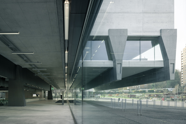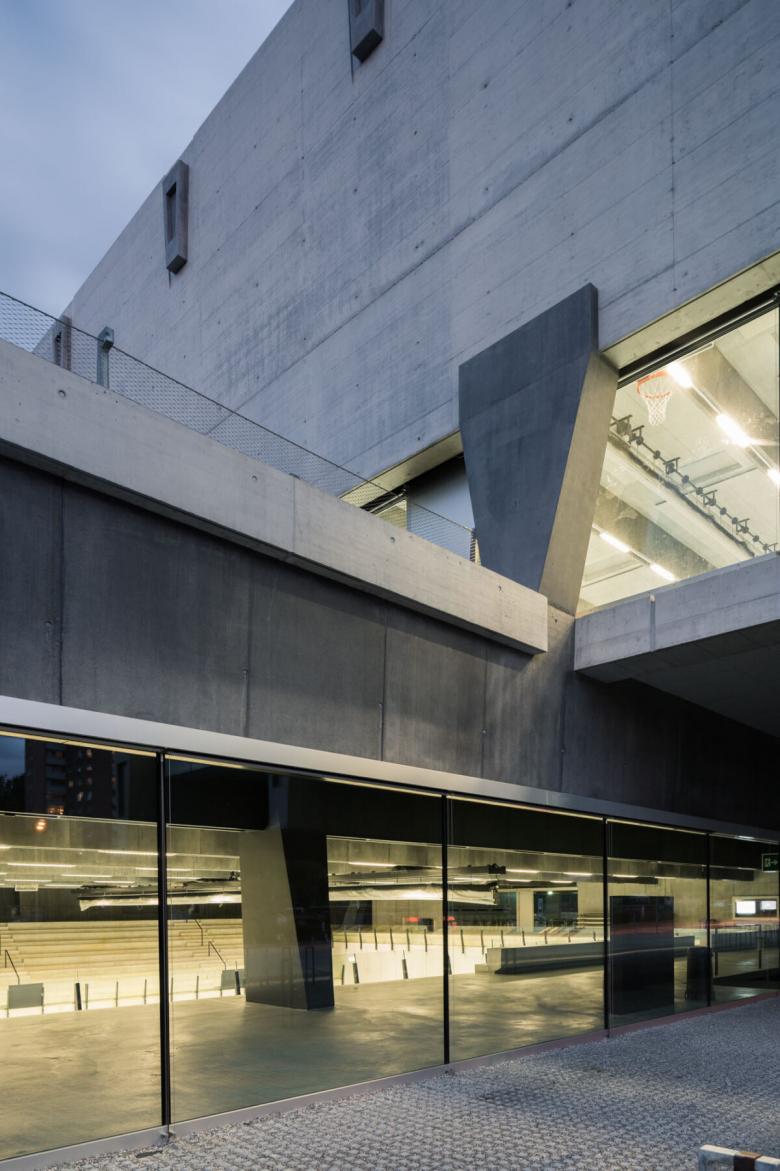 Bei diesem Entwurf für einen Sportkomplex mit einer Wettkampfhalle für 2'000 Zuschauer und einer zusätzlichen Trainingshalle wurden aus städtebaulichen Gründen die zwei Hallen gestapelt angeordnet. Die neuen Hallen werden dabei in den Rhythmus der bestehenden Aussenspielfelder eingereiht und geben ihnen einen entsprechenden Auftakt im städtischen Raum. Die Trainingshalle steht verdreht auf dem Dach der Wettkampfhalle. Die dadurch entstehende kreuzförmige Figur markiert den prägnanten Terrainversatz zwischen der tiefer liegenden Könizstrasse und dem dazu um vier Meter erhöhten Plateau der Aussensportfelder. Das grosse Dach der Halle schliesst niveaugleich an die Aussenanlagen an, während die wesentlich kleinere Trainingshalle darauf als eigenständiger Baukörper in Erscheinung tritt. Diese Aufteilung der Volumina ist entscheidend für die masstäbliche und städtebauliche Integration des nicht unbeträchtlichen Gesamtvolumens in die nähere Umgebung. Die kompakte Kubatur hält grosse Bereiche der Parzelle unbebaut, die so für die Aussenanlagen und ökologischen Ausgleichsmassnahmen zur Verfügung stehen.