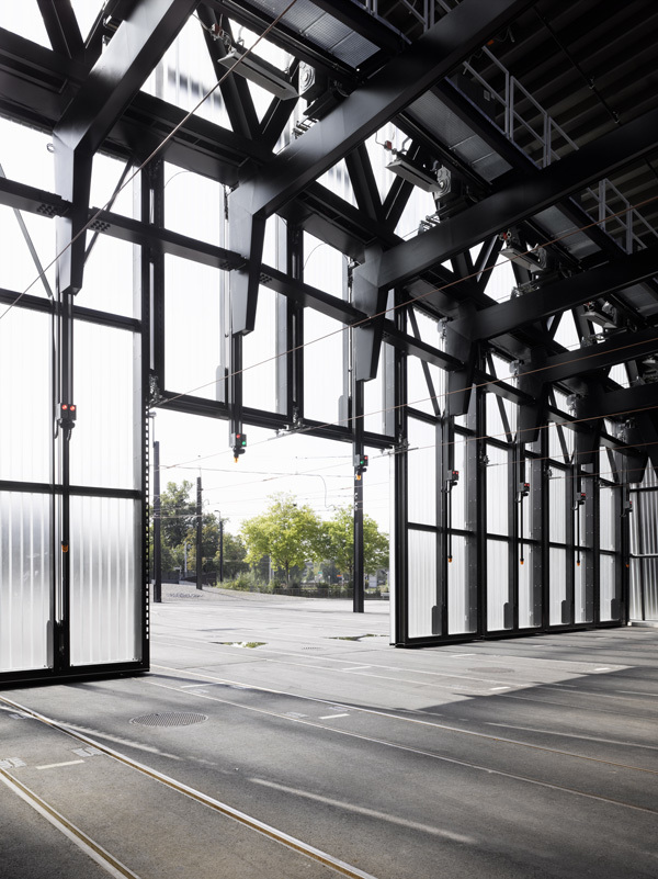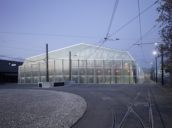 Das äussere Erscheinungsbild der Halle wird geprägt durch die Leichtigkeit der Glas-Aluminiumhülle. Die roten Tramzüge und Signale schimmern schemenhaft durch die transluzente Fassadenverkleidung der grossen Halle. Das aus Linien und Streben zusammengesetzte Tragwerk wird von einer metallisch-gläsernen Hülle überspannt, die dem Bauwerk einen plastischen Ausdruck verleiht.