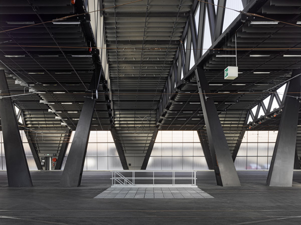 Die Überdachung wird über die gesamte Hallenlänge von rund 200 Metern durch eine Sheddachstruktur aus Stahlfachwerkträger mit Spannweiten von bis zu 90m (Etappe 3) getragen. Eine einzige Stützenreihe trennt den Abstellbereich vom Servicebereich mit Waschanlage, Radbearbeitungsplatz und Unterhaltsgebäude und dient zudem als vertikales Verbindungsglied zwischen dem unterirdischen Leitungskanal und den Installationen an der Hallendecke.