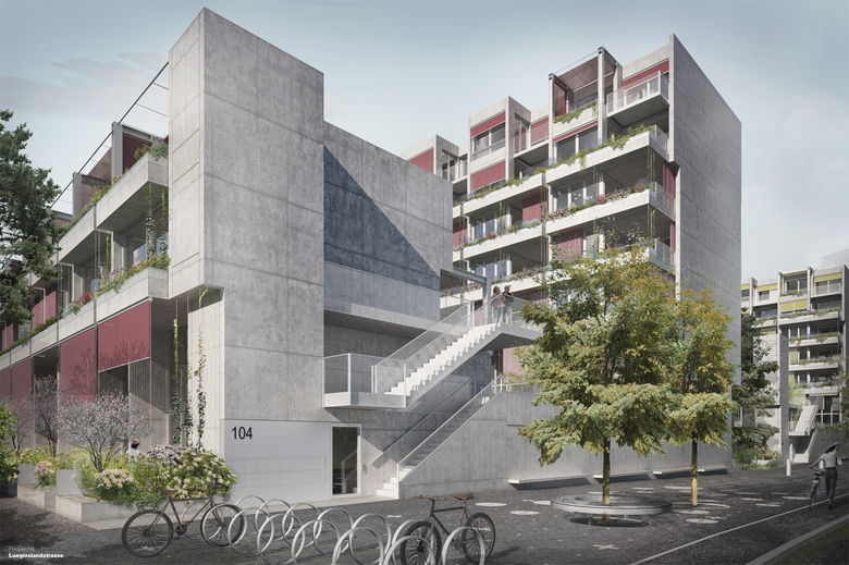 Die unterschiedlichen, höhengestaffelten Freiräume sowie die verdichteten und nutzbaren Grünräume im Erdgeschoss, die Dachflächen über dem 1. Obergeschoss, die Laubengänge entlang der Nordfassaden und die Dachflächen über dem 4.Obergeschoss werden intensiv begrünt. Als dichte Waldgärten werden diese einerseits Teil der Schwellen zwischen privatem Wohnen und öffentlichem Raum und erlauben andererseits ein räumlich gefasstes Angebot von nachbarschaftlichen Aufenthaltsorten ohne Beeinträchtigung des Privaten.