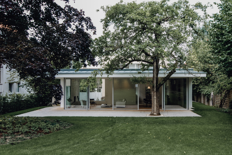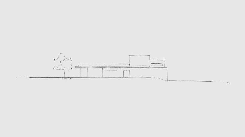 Die Bauherren wünschten ein sonnen- und lichtdurchflutetes Haus. Das Grundstück, lang, tief und auf der Südseite von einem Mehrfamilienhaus beschattet, schien auf den ersten Blick eher ungünstig. So kam es zur Idee eines Atriumhauses, das aufgrund seiner partiellen Einschnürung erlaubt, die Fassade im Bereich der Einschnürung weit Richtung Norden zu verschieben und somit im Süden möglichst viel Abstand vom verschattenden Nachbarhaus zu gewinnen. Das modern interpretierte Konzept des Atriumhauses gab die Möglichkeit, viel Tageslicht ins Innere zu holen und die Geländebedingungen optimal auszunutzen.