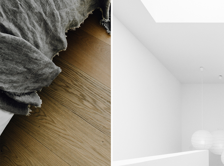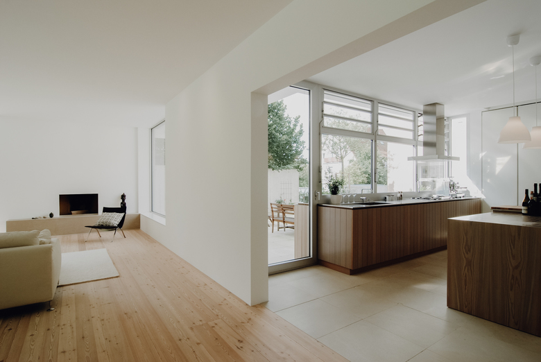 Dies sinnvolle Wohnkonzept unterstützt das harmonische Familienleben. Die gesamte Innengestaltung ist aufgrund des großen Bezugs zum Garten in natürlichen Materialien und Farbtönen gehalten. In die Architektur eingepasste Möbel wie die Garderobe am Eingang sorgen mit vielen Zusatzfunktionen für einen aufgeräumten Empfang. Entstanden ist eine Ruheoase mitten in der Stadt. Ungestört von den Nachbarn kann die Familie ihr Reich genießen.