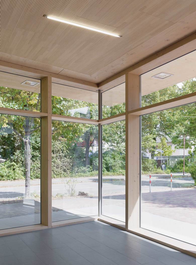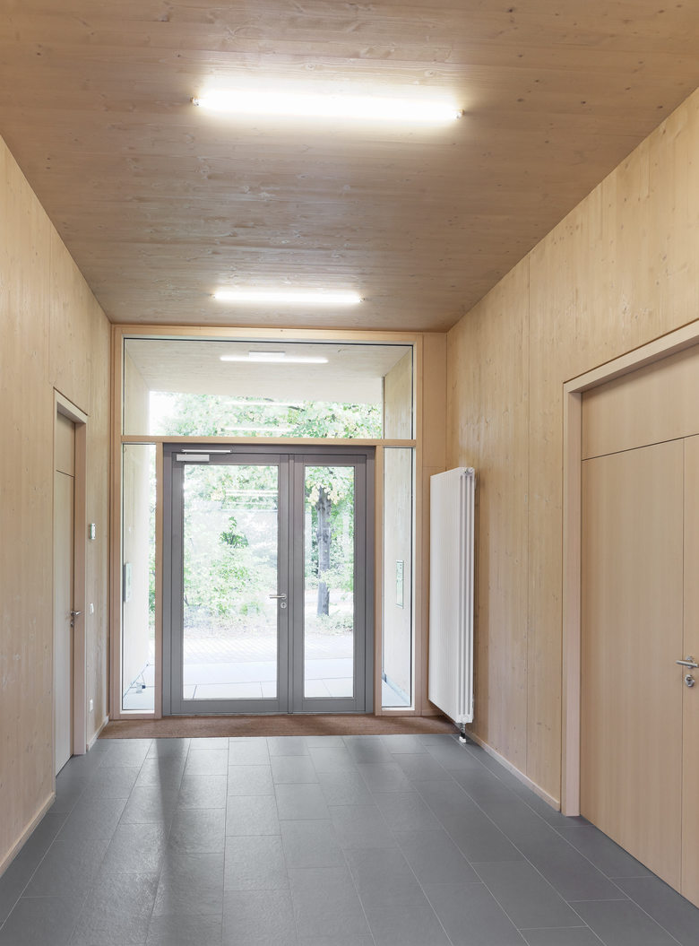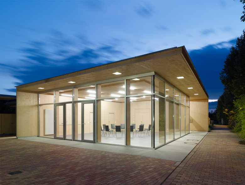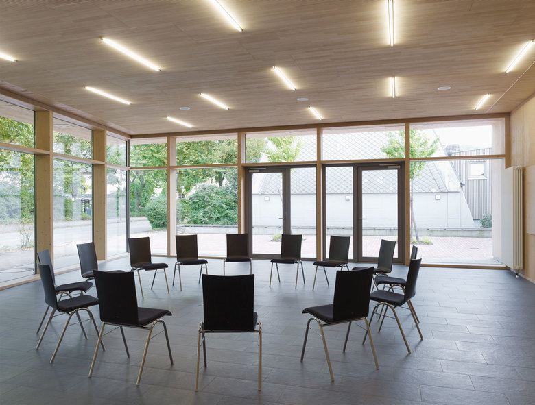 Struktur, Präsenz – Der neue Gemeindesaal befindet sich in der Mitte der Gesamtanlage. Das Gebäude ist in drei Schichten gegliedert, der Saal, die dienenden Räume und die umfassende Wand. Die vor die Kirche in den Straßenraum ragende Ecke des Gemeindesaals ist an der Hauptstraße präsent und überwindet die Lage in der zweiten Reihe.