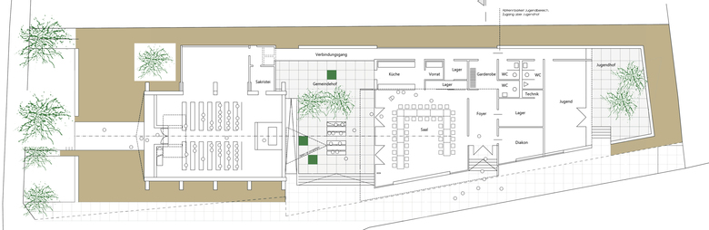 Höfe – Die Gebäude der Matthäusgemeinde werden von drei Höfen eingerahmt. Die Kirche betritt man über den Eingangshof an der Hauptstraße. Dieser ist bereits mit großen Bäumen eingerahmt. Verbindend zwischen der bestehenden Kirche und dem neuen Gemeindezentrum ist der neu geplante Gemeindehof, zu dem sich der Gemeindesaal öffnet. Im Westen befindet sich der introvertierte Jugendhof in direkter Verbindung zum Jugendraum. Die umgebende Wand schafft die notwendige Distanz zum Friedhof.