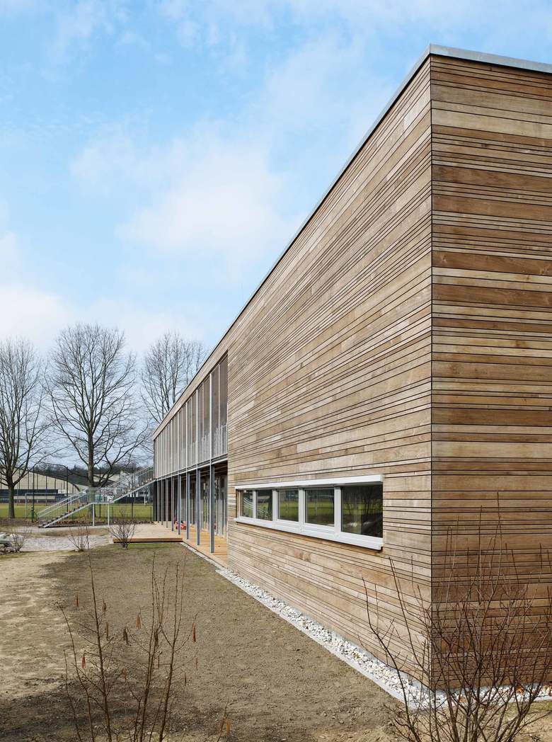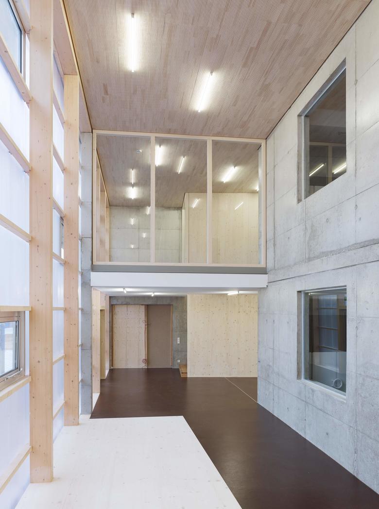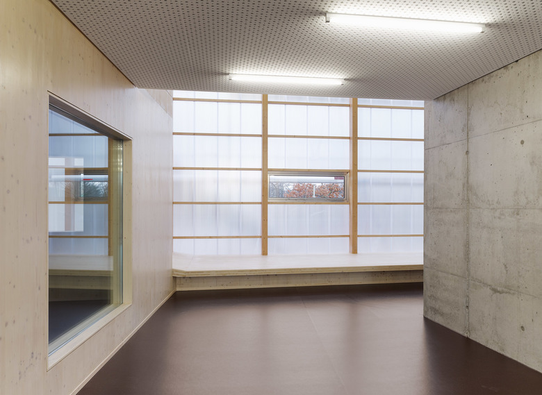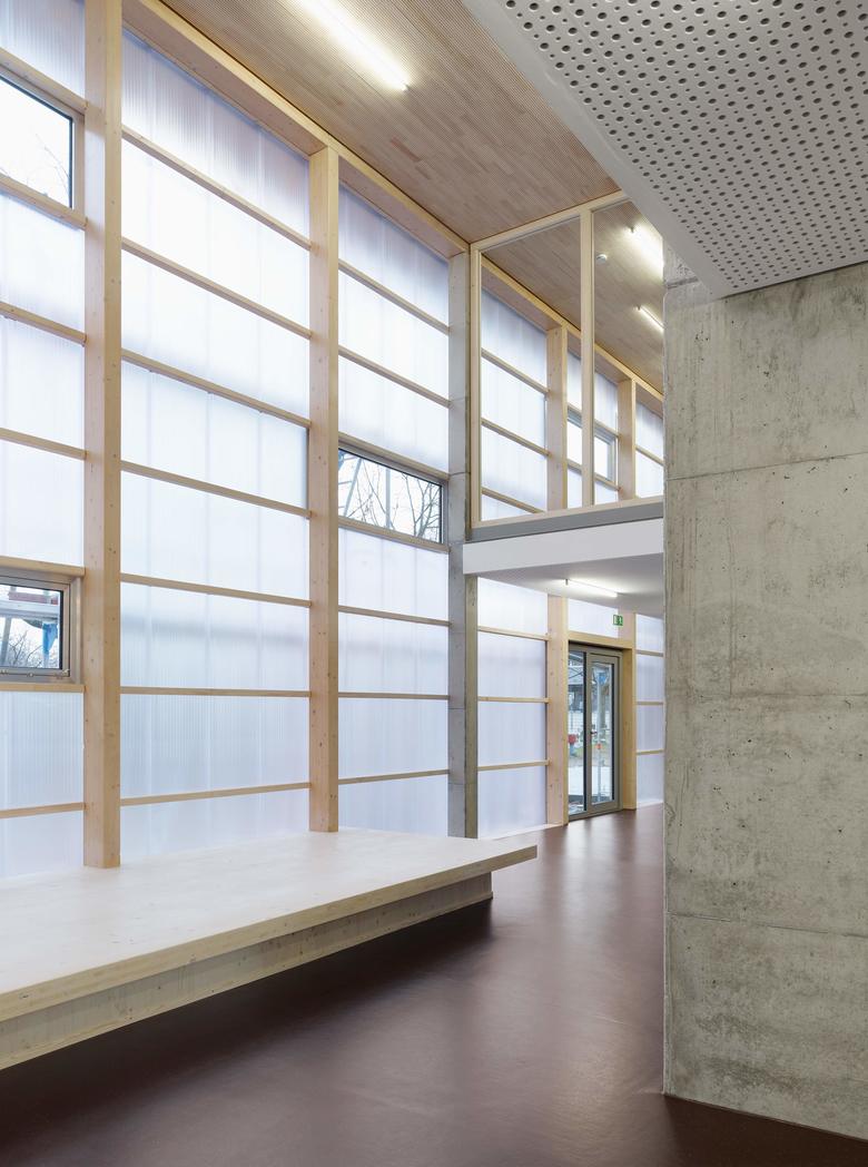 Konstruktion – Sämtliche Überlegungen hatten sich dem enormen Kostendruck, vor allem im Sporthallenbereich, unterzuordnen. Der Ansatz "Rohbau gleich Ausbau" wurde fast in allen Details zelebriert. Gerade Holz, hier vorwiegend Kreuzlagensperrholz, bietet optimale, einfache und kostengünstige Lösungsansätze - trotz hoher gestalterischer Prägnanz. Das über die gesamte Raumlandschaft spannende Holzdach sorgt mit dem Holzleisten-Akustik-Absorber für den notwendigen Schallschutz, aber auch für die angenehme Raumatmosphäre. Neu für uns, nach vielen Holzbauprojekten mit Brettstabeldecken, war die Überlegung eine Betondecke einzubauen. Nach anfänglichem Zögern entdeckte auch der Tragwerksplaner, gerade durch den Einsatz der flächenartigen Kreuzlagen-Sperrholztafeln, die Optimierungsmöglichkeiten durch diesen Ansatz.