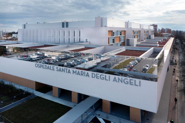 El recinte hospitalari de Pordenone està localitzat en una zona urbana consolidada, limitada per un mur opac i constituït per diversos pavellons de diferents èpoques. El nou edifici es troba dins d’aquest recinte i es proposa com l’espai d’obertura de l’hospital a la ciutat. Per aquest motiu, s’ofereix l’oportunitat de visitar l’estructura per a fer ús de les zones comuns: prendre un cafè, visitar una exposició o comprar flors
