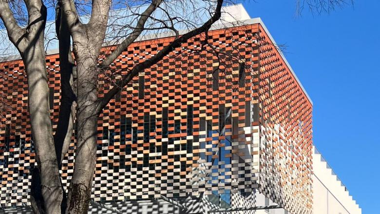 La façana principal es projecta fins el carrer i es transforma en una coberta que marca l’entrada i protegeix als vianants. Al vestíbul, emmarcat en vidre, s’accedeix de d’una plaça dura.