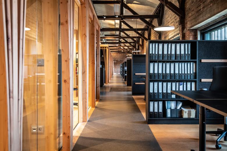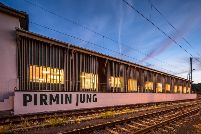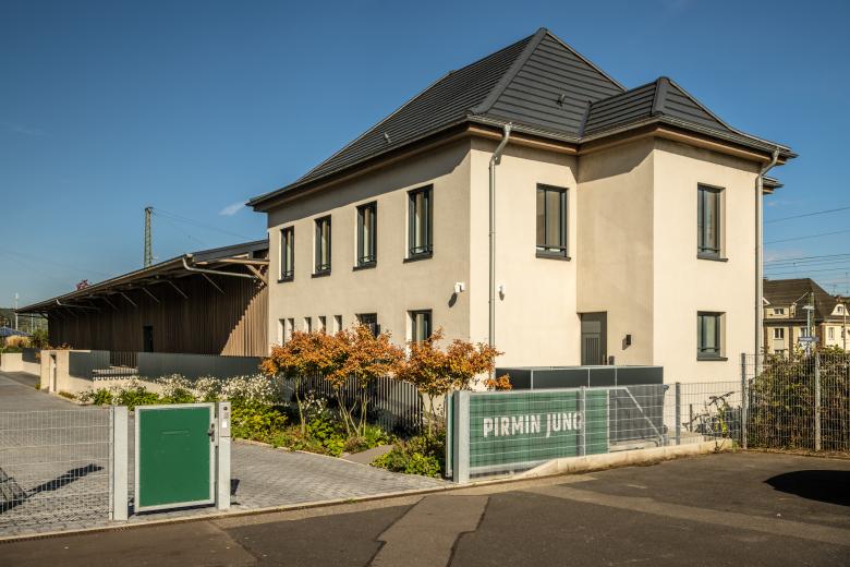 Der ursprünglich als Werks- und Verkaufshalle genutzte Güterbahnhof in Remagen wurde in umfangreichen Umbau- und Sanierungsarbeiten in ein modernes Büro umgestaltet. Das Gebäude fügt sich in die Umgebung ein und wirkt klar als Einheit nach außen. Die besondere Struktur der Holzfassade, die einer Welle nachempfunden ist, vermittelt die Leidenschaft von PIRMIN JUNG für den Baustoff Holz. Die energetischen Maßnahmen setzen auf Nachhaltigkeit und erreichen einen möglichst hohen Autarkiegrad. Durch den Mix aus viel Holz und den erhaltenen, sichtbaren Backsteinmauern wurde innen eine ganz besondere (Arbeits-)Atmosphäre geschaffen. Eine Auralisation im Vorfeld ermöglicht ein durchdachtes Raumkonzept, das ein ruhiges und konzentriertes Arbeiten ermöglicht, ohne den Sichtkontakt zu verlieren. Für genügend Rückzugsorte, in denen die Mitarbeitenden bei Bedarf ungestört arbeiten können, ist gesorgt.