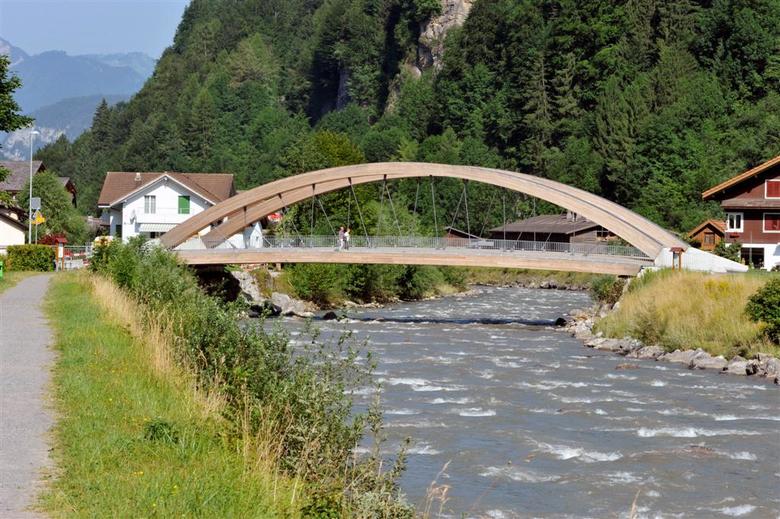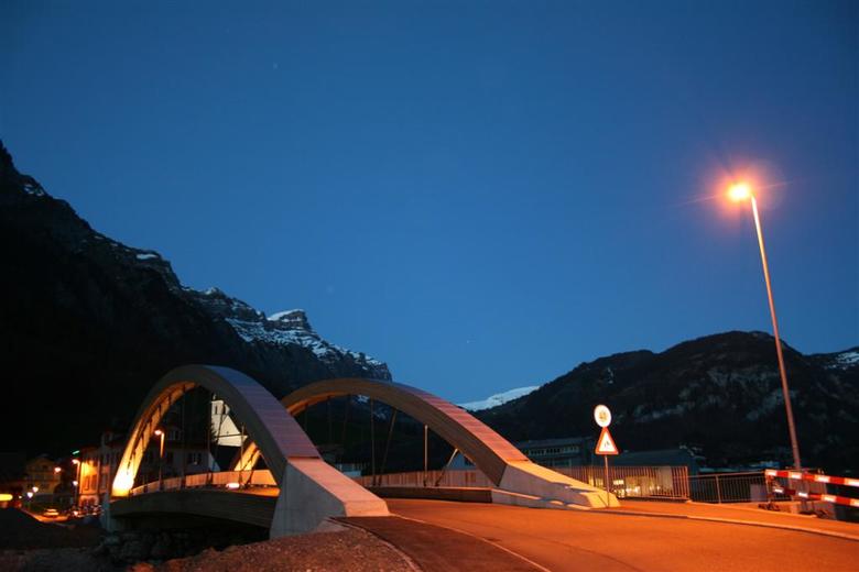 Die Tragkonstruktion wurde auf der alten Brücke vormontiert und mit zwei Teleskopmobilkränen auf die Widerlager gehoben. An den frei gespannten Bogenträgern schwebt die, an Stahl-Zugstangen aufgehängte, Fahrbahn aus grossformatigen Mehrschichtplatten.