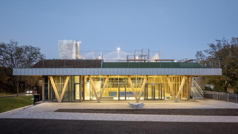 Mit der großzügig gestalteten Kultur- und Sporthalle hat die Gemeinde Alfter einen neuen kommunalen Treffpunkt erhalten. Das Gebäude kann über drei Etagen genutzt werden. Die Event- und Sportfläche ist im unteren Bereich untergebracht, darüber liegt die Foyerebene mit Quartierscafé und Tribünenbereich. Auf der Dachebene befinden sich ein Ballsportfeld mit Fitnessareal. Diese ist ganztägig frei zugänglich und kann unabhängig von der Hallenbelegung genutzt werden. Neben der Nutzung durch Vereine kann die Halle für Veranstaltungen mit bis zu 400 Personen genutzt werden. Die Halle besteht aus einer innovativen Holzkonstruktion, bei der Fachwerkträger aus Buchenholz mit einer Spannweite von fast 25 Metern das Gewicht der Dachkonstruktionen in außenliegende V-Stützen ableiten, die ebenfalls aus Buchenholz gefertigt sind. Die umlaufende Holzkonstruktion ruht auf einem Sockelgeschoss aus Stahlbeton. Das gedrungene Fachwerk erhält durch den Treppenversatz an den Druckstreben ein tragendes und gleichzeitig ästhetisches Detail, das die moderne und traditionelle Holzbaukunst vereint.