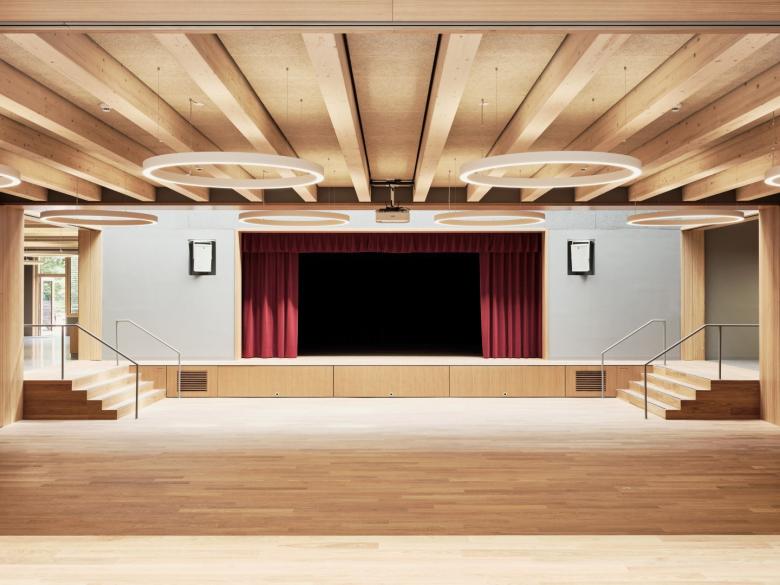 Auf dem Schulareal Weinfelden ist ein dreigeschossiger Neubau aus Holz entstanden. Im Zentrum des Schulhauses befindet sich der grosse Saal, der eine Begegnungszone für die Schüler und Lehrer darstellt. Zwei Lichthöfe führen Tageslicht bis ins Erdgeschoss und sorgen für optimale Lichtverhältnisse. In den Obergeschossen sind die Unterrichtsräume kranzförmig entlang der Fassade angeordnet. Die Schulzimmer können für verschiedene Unterrichtsformen angepasst werden. Im gesamten Schulhaus sind sichtbare Holzelemente eingebaut, die für eine angenehme Atmosphäre sorgen. Das Gebäude ist gemäss dem Minergie-P Standard erstellt.