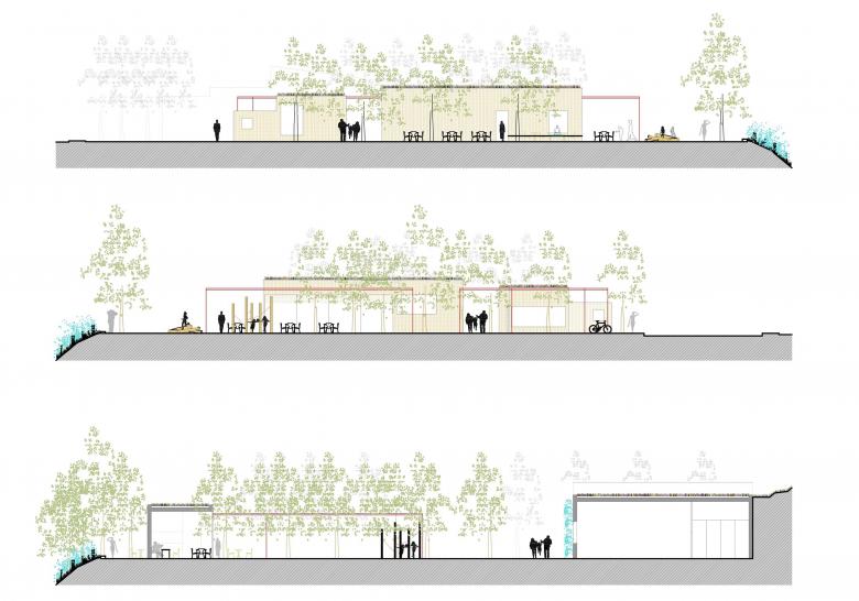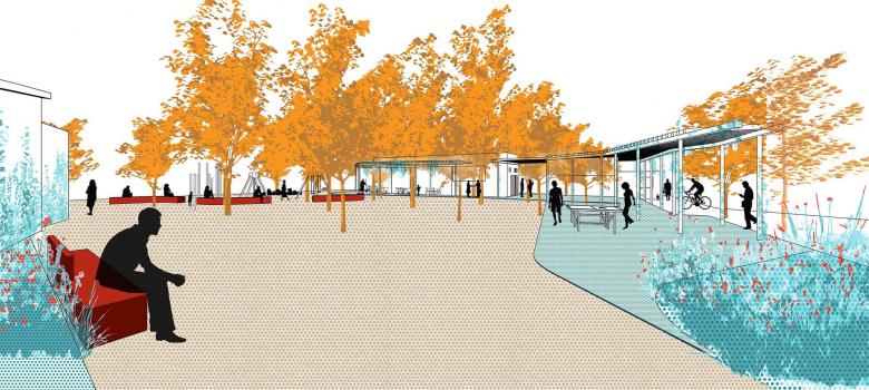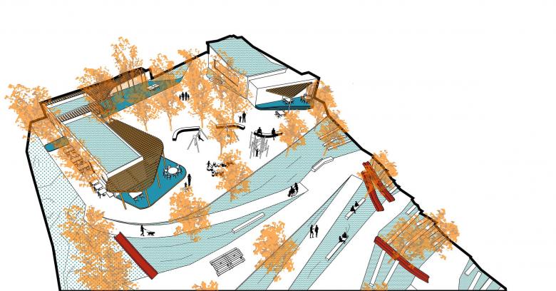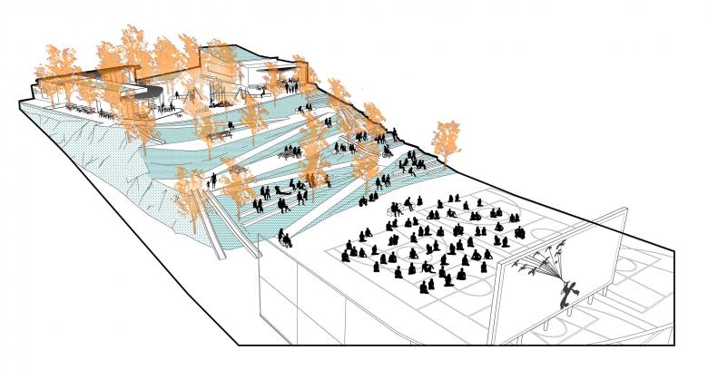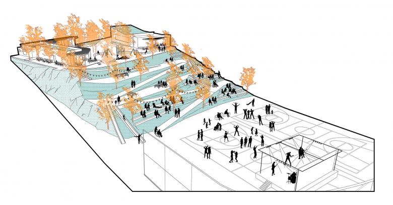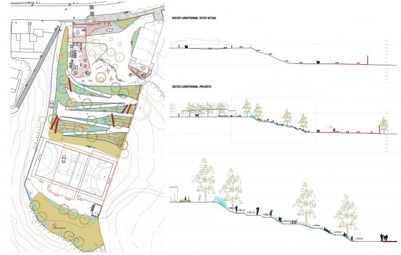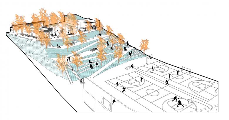 Creación de una zona sociodeportiva y en la zona del talud entre el nivel superior y el inferior, la creación de un graderío integrado en el paisaje.