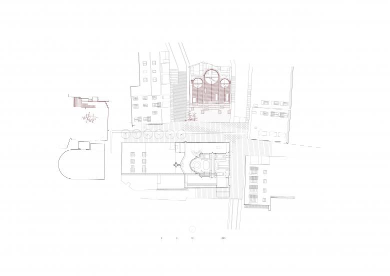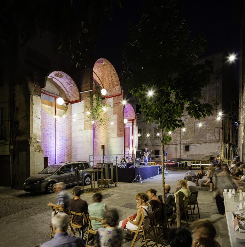 Con ladrillo hueco, se construye una escenografía de urgencia que completa lo que insinúan los contrafuertes, dejando ver en el fondo las huellas de la actividad doméstica marcadas en la medianera. Una construcción de tres bóvedas y cuatro nichos se ofrece al espacio público como una fachada porosa, acompañada de un mínimo graderío. Es una estructura inacabada y apropiable. El artista visual Quim Domene interviene a posteriori en los nichos, con elementos alegóricos a la historia del barrio.