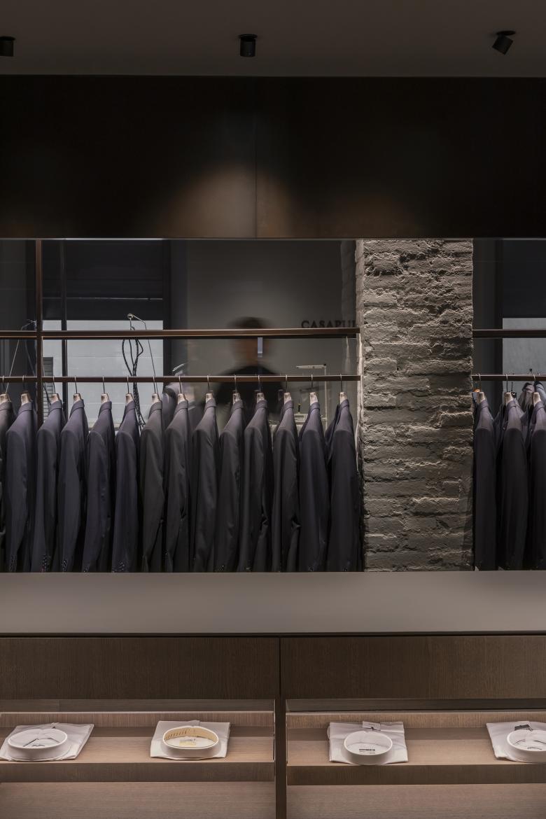 Las dos caras, la nueva y la antigua, coexisten en equilibrio desde el momento en que el visitante cruza el umbral. Las curvas, elemento recurrente en el proyecto, definen el recorrido a través de las áreas dedicadas a hombre, mujer, sastrería y taller. Estas formas no solo suavizan el tránsito visual y físico, sino que también se aplican como detalle en las estanterías de exposición de ropa, remarcando el trabajo artesanal de la intervención.