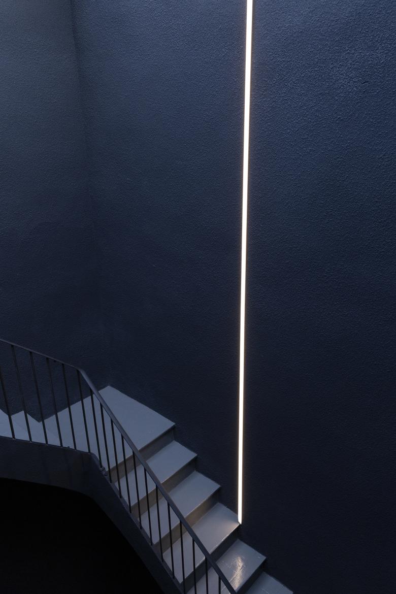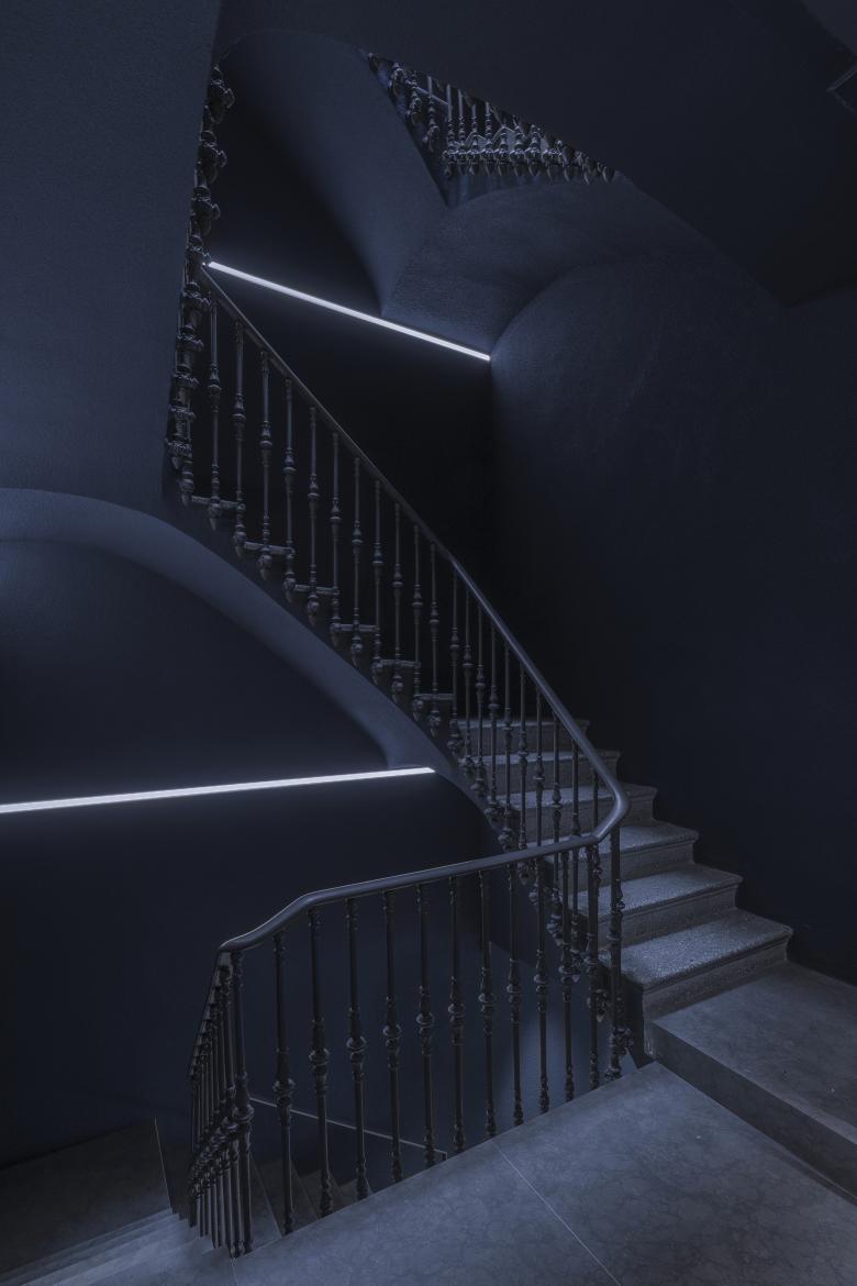 Una vez dentro, dos vacíos verticales articulan la comunicación espacial: la escalera y un patio de luz. La escalera, un elemento arquitectónico protegido, se transforma en una pieza central a través de un diseño lumínico que la trata como una instalación artística. Aprovechando las irregularidades de la medianera, el juego de luces verticales, horizontales y transversales no solo acentúa su presencia, sino que convierte el defecto en virtud. Paralelamente, el patio de luz natural se amplía para bañar desde la planta superior hasta la baja, iluminando el mostrador y rescatando áreas antes oscuras. Ambos huecos verticales, acabados en proyectado azul petróleo, crean una conexión visual y material que cruza todas las plantas, unificando la propuesta y reforzando la nueva narrativa del espacio.