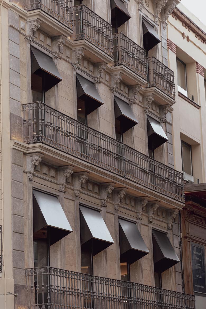Las dos fachadas del edificio se definen por toldos de acero en acabado bronce. Más allá de proporcionar sombra, a través de estos elementos rígidos se buscaba aportar una plástica más compleja y contemporánea al diseño.