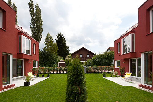 Die beiden Doppelhäuser am dichten und zersplitterten Stadtrand streben nach einer klar erkennbaren Form, ohne den Maßstab zu verlassen. Die Standardfarbe der Dachplatten ist als Hauptfarbe übernommen und steht in Kontrast zu den weißen Kunststofffenstern. Ein pragmatischer Gestaltungsgriff, der den Baukörpern etwas Körperhaftes und doch Künstliches verleiht.