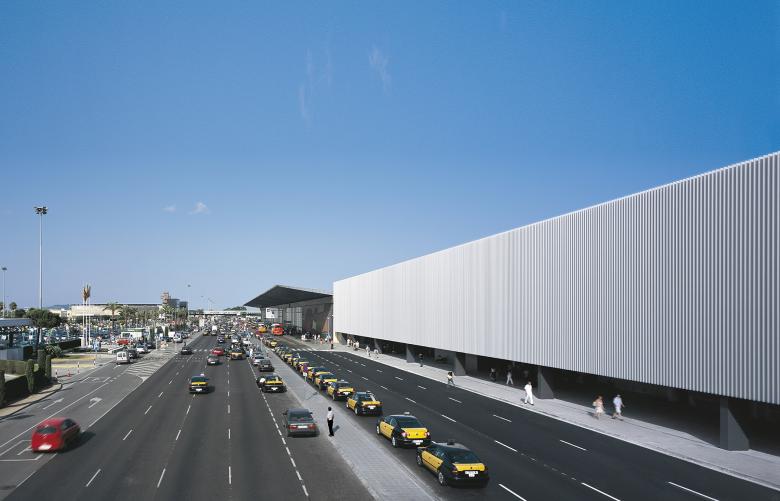 El edificio intermodal y de conección con las Terminales A y B se caracteriza exteriormente por una fachada que está mas alla de la propia dimension del edificio, ya que se intenta establecer una continuidad entre las fachadas de la Terminal B, desde el mural de Miro y de la Terminal A.