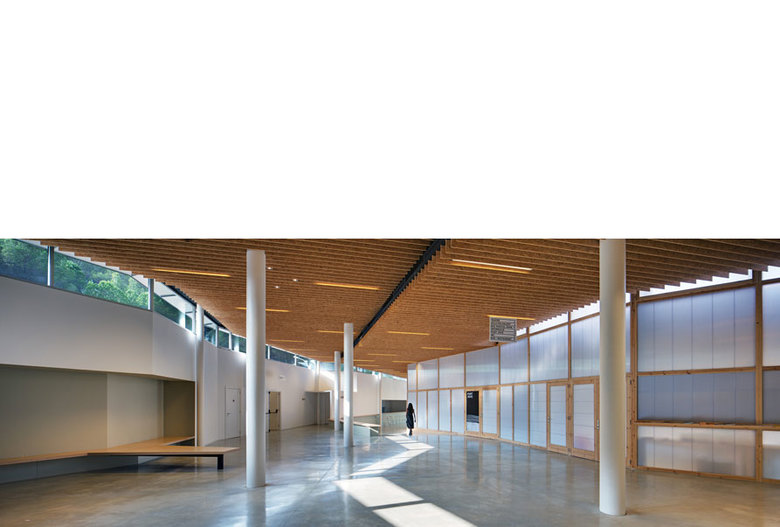 Inside, each part of the programme finds its natural place, almost respecting the hydraulic logic by which erosion and sediment define the edge of the bank of the stream. Thus, the inside is organised in longitudinal layers tracing the line of the stream and resulting in more or less dilated spaces, which have a progressive materiality more dynamic, fluid, clear and watery near the facade of the stream and more solid, opaque, private or stony in front of the mountain. Mainly the library but also Espai Nou, Punt Jove and the bar are developed along this opening landscape facade which offers magnificent sightseeing options. The theatre, the rehearsal boxes and the various more closed type services are in the last layer or farthest place of the stream. All these spaces are articulated through an agora whose morphology, materiality and natural lighting procure a natural atmosphere which recalls the one enjoyed touring the stream.