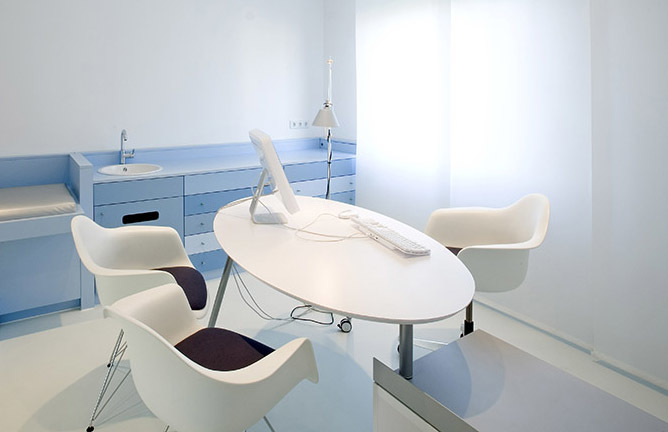 Inspirationsquelle für den Entwurf der Gastroenterologischen Praxis war ein Song des Surfidols, Songwriters und Sängers Jack Johnson: „bubble toes“. Die innenarchitektonische Gestaltung erzeugt eine fließende, harmonische und gedämpfte Stimmung – wie eine Art Unterwasserkosmos. Bunte Fische, glitzernde Reflexe und ein nicht begrenzendes Raumkontinuum sind die Imaginationen, die diesem Entwurf zugrunde liegen. Die Patienten können sich fühlen, als wären sie durch einen Spiegel gegangen, hätten ihre Welt hinter sich gelassen und wären in eine Neue getaucht. Fremd und doch seltsam vertraut. Die Heilkraft der Architektur ist davon abhängig, in wie weit sie das Bedürfnis nach Aufgehobensein in einem großen Ganzen wecken kann. Um die Vorstellung einer Traumwelt zu generieren, ist hellblaues Epoxidharz für den Boden genutzt worden, um Fugenbilder und Richtungen zu vermeiden. In diversen Blautönen matt gestrichene Wände verstärken die Unterwasserimagination. Für den einheitlichen Gesamteindruck sorgen neben wassertürkisen Fliesen die übergroßen Fischwandbilder und die individuell gefertigte Möblierung aus blau beschichtetem MDF. Den durchgängig blau-weißen Farbkanon ergänzen die Sitz- und Warteelemente. Welcher angenehme Traum aber nun genau in den Köpfen der Praxispatienten abläuft, wenn sie sich durch die Praxis „treiben“ lassen, das darf das Geheimnis jedes einzelnen bleiben – Hauptsache der unangenehme Gedanke an die bevorstehende Untersuchung wird gemildert. Und somit hat die Architektur die wichtige Aufgabe, Geborgenheit – und sei es mit einem Augenzwinkern – zu vermitteln, erfüllt.