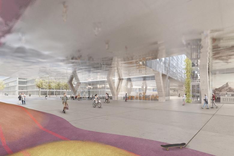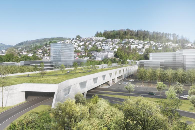 Um die Innenstadt von Luzern vom Verkehr zu entlasten, soll im Westen der Stadt ein neuer Autobahntunnel in Richtung Kriens entstehen. Am südlichen Portal wird die heute vierspurige Grosshofbrücke auf acht Spuren erweitert. In der Überzeugung, dass ein derart grosses und teures Bauwerk nicht nur dem Verkehr dienen sollte, konzipierte unser Team ein multifunktionales Gebäude mit einer Autobahn im Zwischengeschoss und einem Dachpark mit spektakulärer Aussicht auf den Pilatus und das Alpenpanorama.