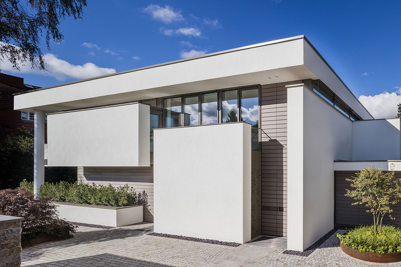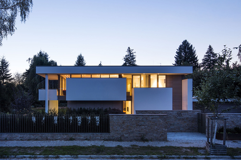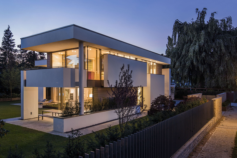 Die Gebäudehülle fällt durch ihre 3-Dimensionalität auf. Die Fassade ist nicht einfach eine Wand mit Fensteröffnungen, sondern besteht aus einem Glas- und Keramik-„Kern“. Weiß verputzte Wandscheiben scheinen davor zu schweben. Diese schützen die Bewohner vor neugierigen Blicken, lassen aber durch ihren Abstand von der Glasfassade viel Licht ins Gebäudeinnere. Durch so viel Transparenz wird maximaler Bezug zur umgebenden Natur ermöglicht. Das weit auskragende Dach sorgt für Verschattung im Sommer und schließt die 2. Gebäudehülle optisch ab. Der Raum zwischen Glasfassade und Wandscheiben bietet sich an für Terrassen und Balkone. Die Kombination aus der spiegelnden Glasebene und den davor schwebenden weißen Flächen verleiht dem Gebäude eine moderne Anmutung. Doch der Purismus der Moderne erhält hier eine leichte, spielerische Note und verliert seine Kühle durch das dreidimensionale Spiel von Formen, Material, Licht und Farbe.