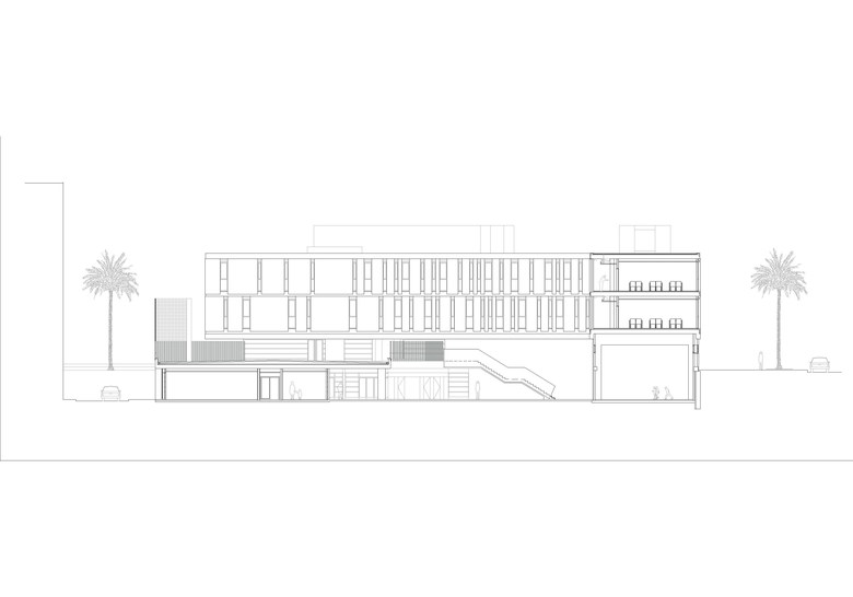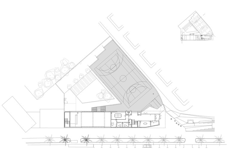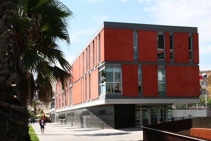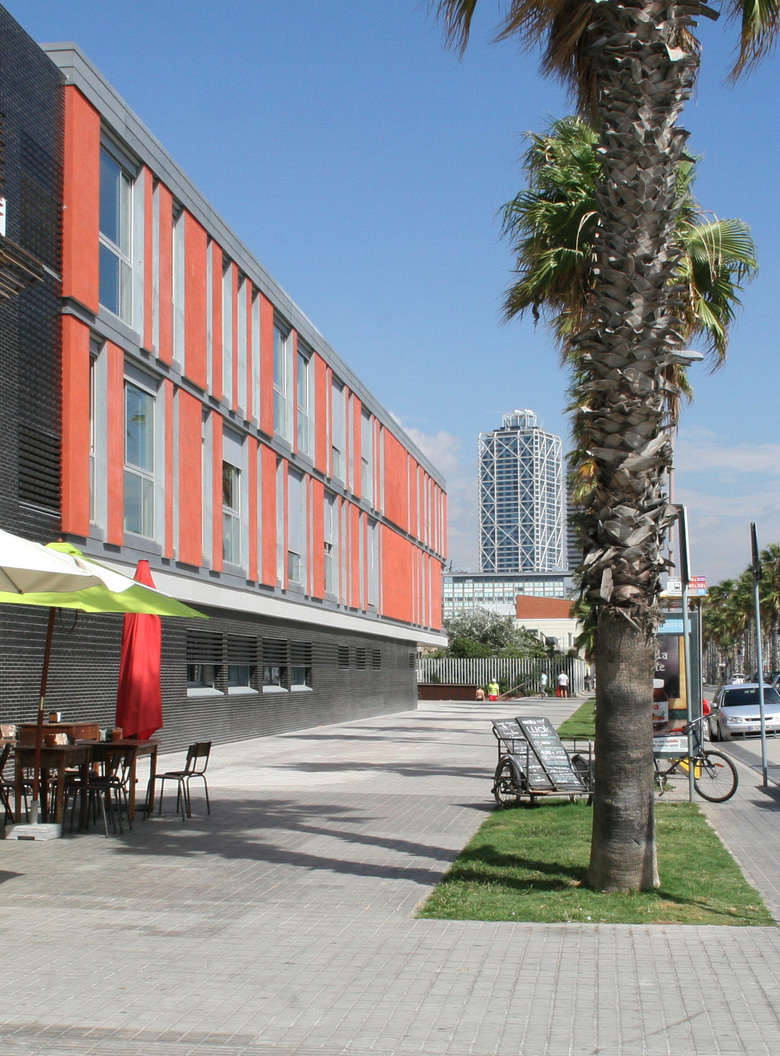 La Barceloneta es va urbanitzar per a allotjar als habitants del barri de La Ribera que havien perdut les seves cases després de la Guerra de Successió. El traçat al biaix del barri respecte la línia natural de la costa alineava els carrers de manera que, des dels baluards de la Ciutadella, es pogués bombardejar als seus habitants si les autoritats militars ho creien convenient. L’Escola Mediterrània soluciona el biaix amb l’aulari -un cos de totxo esmaltat negre a la base i estuc roig combinat amb zenc en les dues plantes superiors- paral•lel al Passeig Marítim i aprofita el desnivell respecte la Plaça Hilari Salvador per a crear dues plantes baixes amb dues entrades. A nivell de barri, el de la Plaça Hilari Salvador, hi ha l’accés de l’ensenyament infantil, el menjador, la porxada, el pati i el gimnàs. A nivell del Passeig Marítim hi ha l’ensenyament primari i la pista esportiva que, de manera visual, és la prolongació de l’espai públic a dins del nou equipament educatiu.