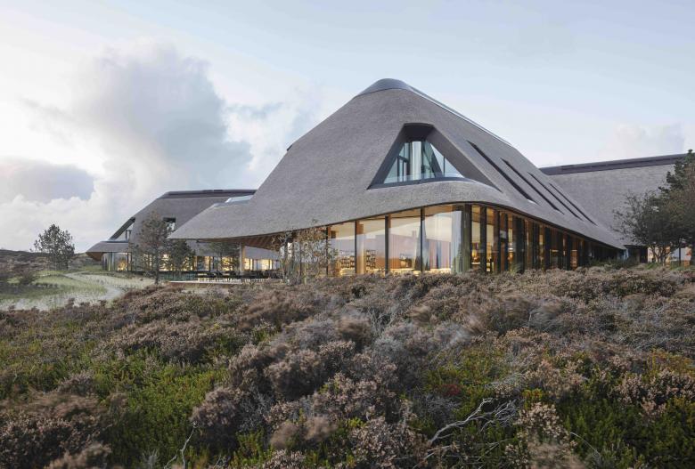 Besonders imposant ist das Reetdach des Hauptgebäudes mit einer Gesamtfläche von 7.000 Quadratmetern, das drei Gebäudeteile zusammenfasst. Auch die Außenbeleuchtung gibt sich zurückhaltend und ist auf die Umgebung abgestimmt. Sie erfüllt alle Anforderungen an den Naturschutz, den Küstenschutz, den Dünenschutz und den Vogelschutz und schafft eine stimmungsvolle Beleuchtung mit beruhigender Wirkung.