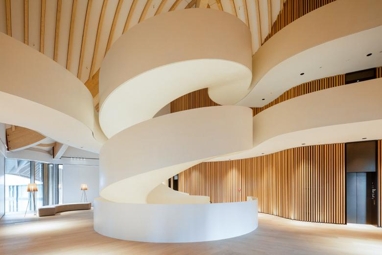 Licht wird im Lanserhof Sylt als Gestaltungselement eingesetzt, das bewusst auf spektakuläre Inszenierungen verzichtet und Hand in Hand geht mit dem Anspruch der Architektur an fließende Formen, minimalistische Lösungen und dezente Farben. Die Beleuchtung ist zurückhaltend, aber wirkungsvoll in die Gebäudearchitektur integriert und erzeugt eine warme, einladende Atmosphäre. Im Mittelpunkt steht die bevorzugte Nutzung von Tageslicht, das bei Bedarf mit Kunstlicht ergänzt werden kann. Ein architektonisches Highlight ist die geschwungene Freitreppe im Innern des Gebäudes. Mit einer indirekten Beleuchtung wird das skulpturale Erscheinungsbild der kreisförmigen Treppe, die von der Tiefgarage bis ins oberste Stockwerk führt, verstärkt.