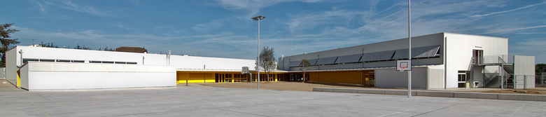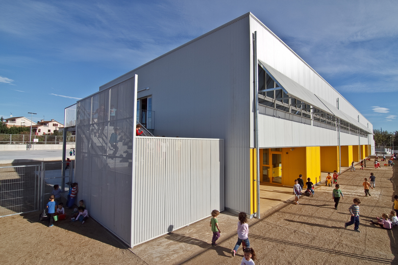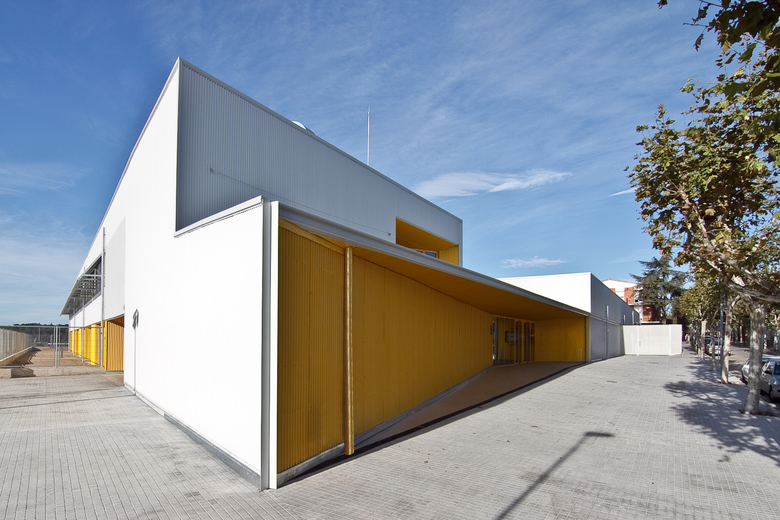 The building joins two urban plots: the garden city with houses and a new residential area of large buildings. Building is an L shape, with a bar downstairs parallel to the only urbanized street, street Torre Esteper, which includes all program services: gym, kitchen, dining room, library and administration; and another bar base and first floor parallel to a street under the new plan, which contains educational program: child classes downstairs and primary and supplementary classes on first floor. Like a rotary element of all spaces, large double height lobby with access to child area and primary zone and it serves as a connection with administration, services and patio. To meet tight construction deadlines (10 months), we work with structural and constructive pre industrialized systems. A precast concrete in the two large ships combines with a metallic structure in the lobby area, porches and changing room.