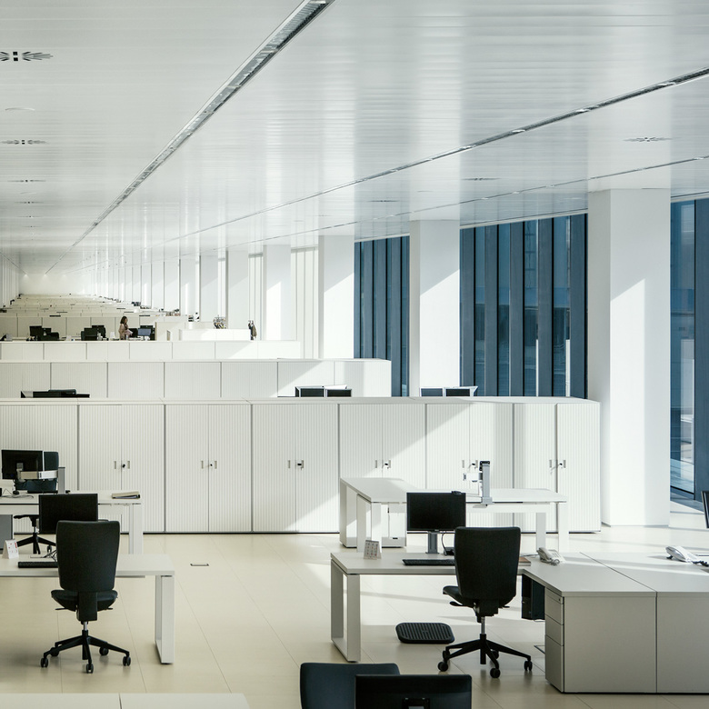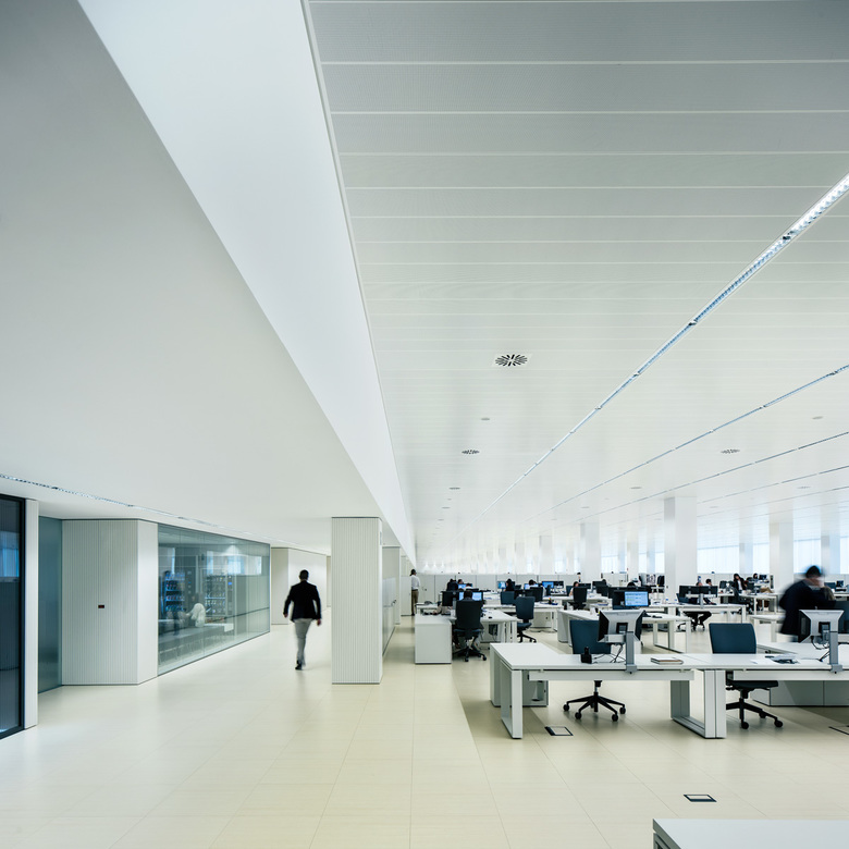 La planta baixa constitueix un gran espai d'accés exterior cobert i les plantes 1 i 2 s'organitzen mitjançant una franja longitudinal de peces de servei on s'agrupen els nuclis de serveis, 3 patis doten de llum natural algunes peces com offices o sales de reunions.