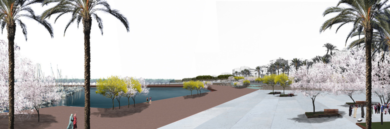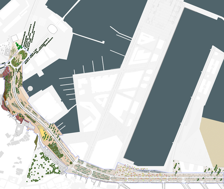 En els seus extrems, el projecte resol el contacte de les infraestructures portuàries amb les noves zones urbanes: en l'extrem nord, articula els accessos als molls de ferrys i el port de pescadors: en l'extrem sud, s'obri al port esportiu i la platja.