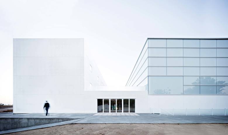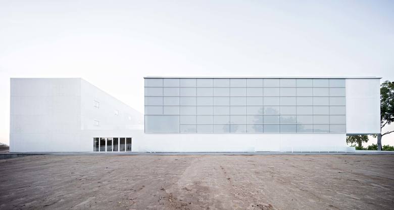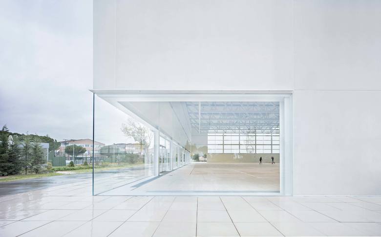 The sports pavilion is designed with lightness in mind, in glass fiber reinforced concrete GRC, unlike the more closed and heavier classroom complex and low interconnecting building, with their white concrete finish. The volume of the sports complex is a decisive differentiating factor in terms of orientation, so that the facades of the southern dihedral, more exposed to sunlight, are enclosed in a prefabricated panel of glass fiber reinforced concrete GRC, while those of the northern dihedral are in translucent glass. The southwestern facade features a low strip of transparent glass highlighting the link with the main square of the campus. And this mechanism of transparency is repeated on the north eastern facade facing the upper patio. Thus a visual relationship is created between the square and the sports complex, while the southwestern façade of the classroom complex becomes a backdrop to the complex as a whole.