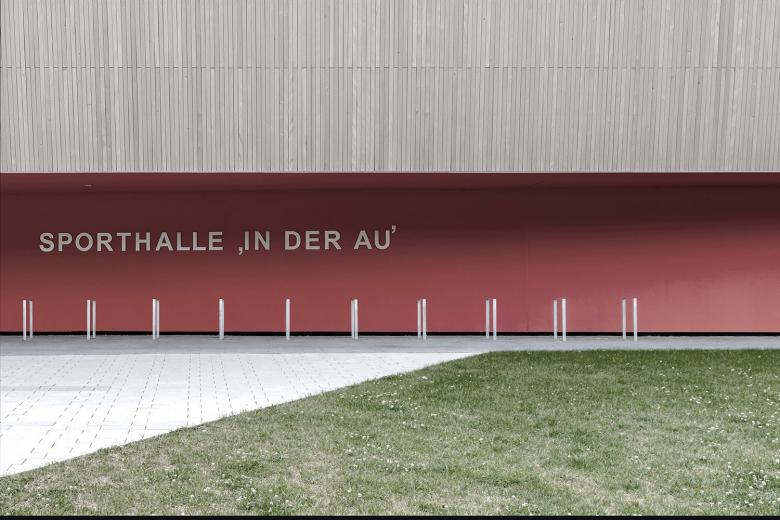 Die neue Zweifachsporthalle „In der Au“ befindet sich am Übergang der Wohnbebauung zur freien Landschaft. Durch die Lage der Halle im Bereich der vorhandenen Böschung kann mit minimalen Erdarbeiten die Spielfeldebene mit den Geräteräumen gegenüber dem Eingangsgeschoss abgesenkt werden, und es entsteht eine Zuschauergalerie mit ungehindertem Blick auf das Sportgeschehen und in die Landschaft. Die Zuschauergalerie dient gleichzeitig der Erschließung der erdgeschossigen Umkleideräume.