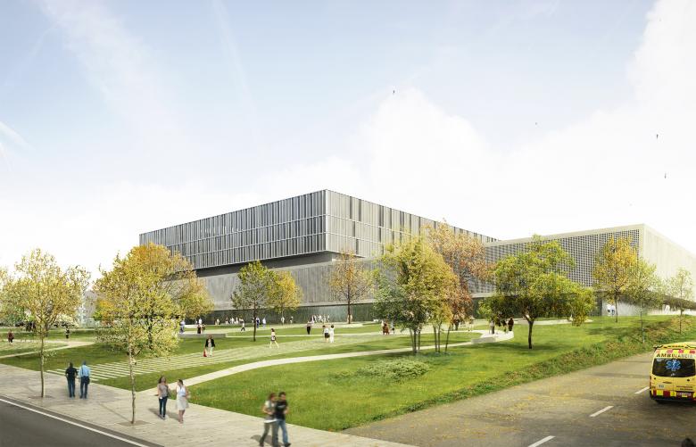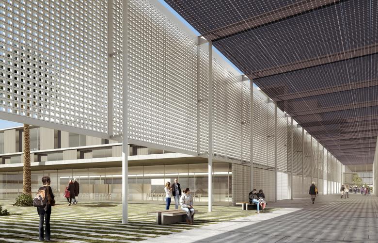 En el extremo norte, el espacio público en el que actualmente se ubica el aparcamiento, se convertirá en un Jardín donde la topografía se irá adaptando a los diferentes usos, junto a un espacio más duro, que hará las veces de antesala y acceso al Hospital, como inicio de la Rambla. En el extremo sur, la Rambla integrará lateralmente a una plaza pública ubicada entre el edificio de administración y el edificio docente. Esta plaza pública conectada con la trama urbana desde los soportales del edificio administrativo, incorpora en uno de sus extremos la cafetería actual y los laboratorios en el edificio existente, englobándolo para dotar al conjunto de una nueva imagen.