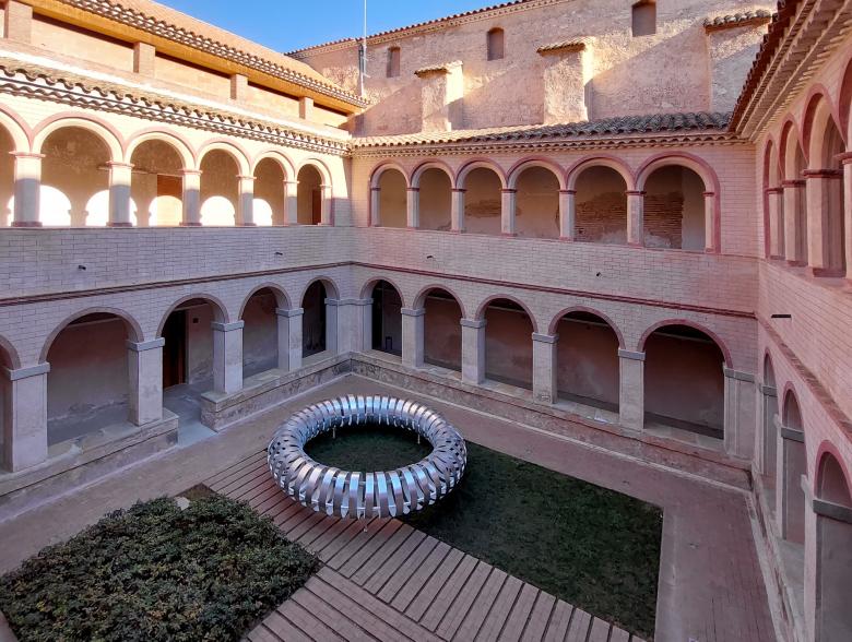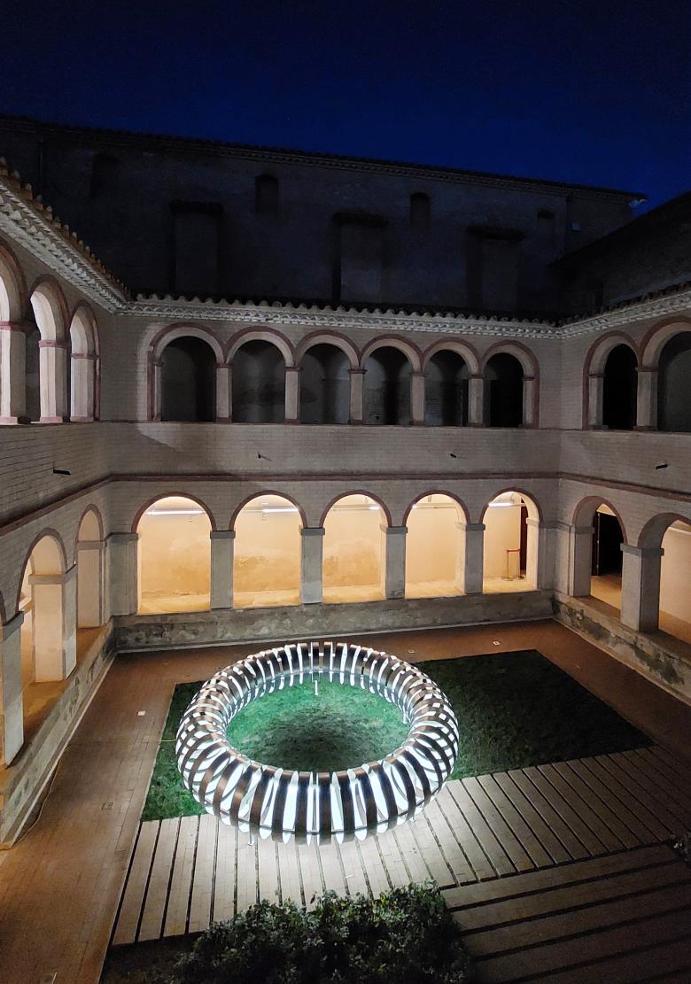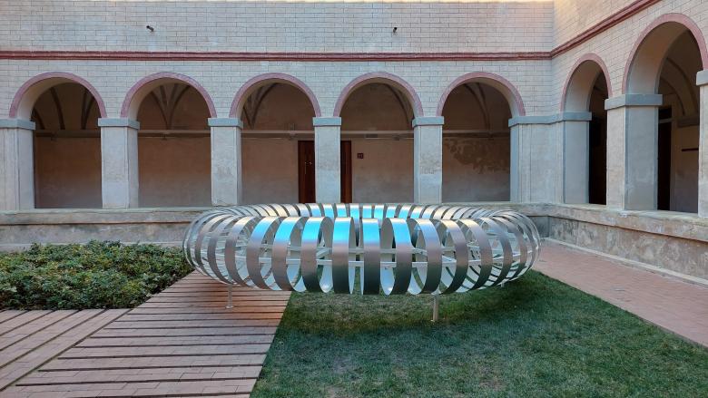 Origin, an abstraction of a toroid. Formed with slats to give a glimpse of the interior and with a subtle color change that allows you to highlight its volume and react to changes in ambient light during the day.