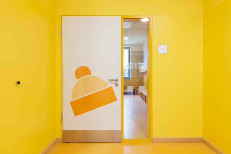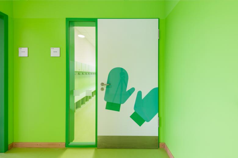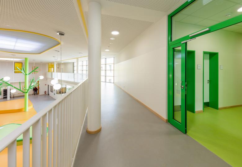 Innen zeigt sich die Schule als farbenfroher Erlebniswald. Grün, Gelb und Orange weisen den Weg durch die Lernlandschaften, große Piktogramme und Symbole helfen bei der Orientierung. Das lichtdurchflutete Foyer ist als Aula und Veranstaltungsraum multifunktional nutzbar. Lichtkuppeln und Leuchten fördern eine angenehme Aufenthalts- und Lernatmosphäre.