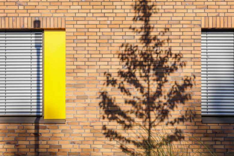 Die h-förmige Gebäudestruktur nimmt Bezug auf die Umgebung und schafft geschützte Außenbereiche für Spiel, Sport und Pause. Die Backsteinfassade sowie farbige Akzente an Fenstern und Türen setzen gestalterisch regionale Bezüge und geben der Schule eine freundliche Ausstrahlung.