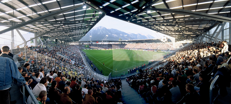 Die Qualität des Projektes zeichnet sich vor allem durch die klaren Zonierungen, die Übersichtlichkeit der Erschließung sowie das Spannungsverhältnis zwischen Innen- und Außenerlebnisbereichen aus. Besonderes Augenmerk wurde auf die Aufstockung der vorhandenen 15.000 auf 30.000 Zuschauerplätze gelegt. Eine Anforderung, die die Planung mit architektonischer Qualität und einem intelligenten Nutzungskonzept optimal erfüllte. Bei der Gestaltung hat man zunächst daran gedacht, einen Fußballkessel zu schaffen, diesen aber so in das Stadtgefüge zu integrieren, dass die umliegenden Bergketten Teil der Inszenierung werden. Zwei Merkmale charakterisieren die Anlage: die aufsteigende Betonschale mit einer filigranen transparenten Hülle aus Metall sowie die hart geschnittenen Eckbereiche mit den über ca. 50 m frei gespannten Fachwerkträgern.