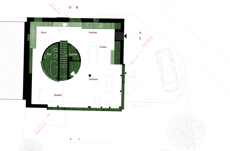 Die alten Ställe hatten Dachstühle, die grosse Räume überspannen konnten. Dieser Umstand wird genutzt und sämtliche nichttragenden Wände werden entfernt, um im Erdgeschoss einen grossen Raum zu schaffen, nur zoniert durch einen leichten, hölzernen runden Kern. Dieser Kern schafft einen fliessenden Bewegungsraum und bildet rundherum Orte heraus zum Kochen, Arbeiten, Wohnen und Spielen. Das Haus wird zum See hin geöffnet: In der Nordost- und in der Nordwestfassade wird ein Fensterkasten mit raumhohen Verglasungen aussen vor die alte Tragstruktur aufgesetzt, der den Blick in die Ferne öffnet. Das ursprüngliche Eingangstor zur Strasse wird als grosses hohes Fenster wieder reaktiviert, um einerseits zum Hang hin den Blick hinauf zum Berg zu ermöglichen und gleichzeitig die Mittagssonne ins Haus zu holen.