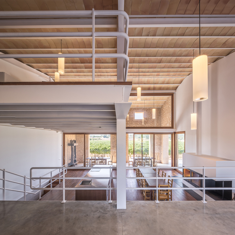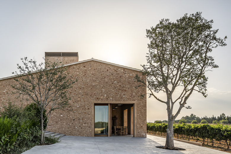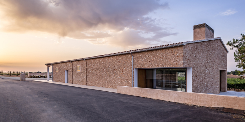 Der inneren Konstruktionsebene ist ein Kleid aus Bruchsteinmauerwerk vorgelagert, wodurch die äußere Erscheinung bewusst auf die traditionelle mallorquinische Baukultur Bezug nimmt. Farbe und Material des Bruchsteinmauerwerks finden ihren Ursprung im Boden der Weinreben und verweben das Weingut mit seiner Umgebung. Im Innern bleibt die Stahlstruktur lesbar und wird als konstruktives Element weitergeführt. Der Stein und die Erde der Umgebung bleiben auch im Innenraum spürbar, in spezieller Ausformulierung der Gewölbedecke als Kappendecke.