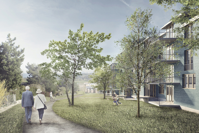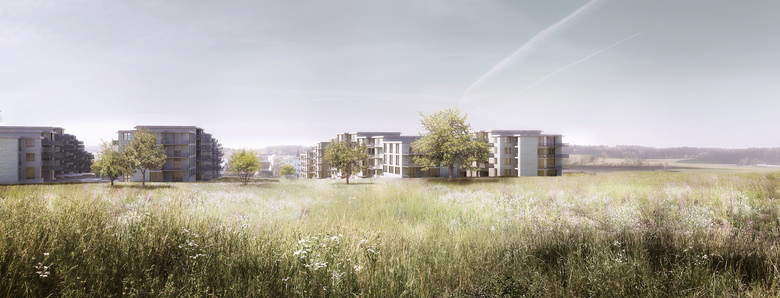 Im zentralen Zwischenraum fliesst die offene Wiesenlandschaft in die Siedlung ein und erhält den Neubauten wie auch den bestehenden Bauten im Süden den Bezug zum Kulturland. Der sanfte Wiesenhang bleibt mit der Wohnbebauung sichtbar und spürbar.